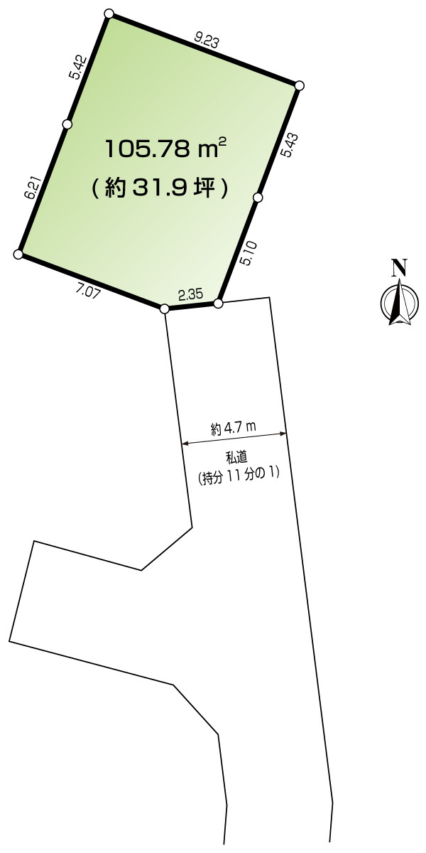 | 接道状況 | 一方 (北西側 私道4.7m 間口2.3m) | ||