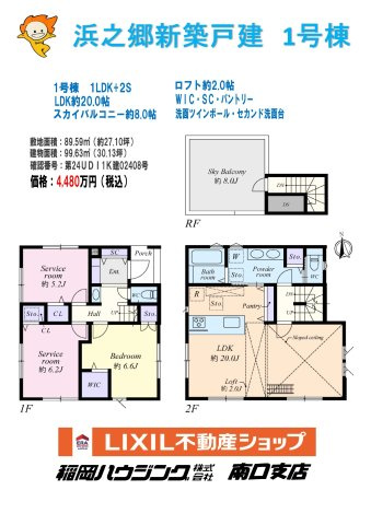 | 建物面積/坪数 | 99.63㎡ / 30.13坪 | 土地面積/坪数 | 89.59㎡ / 27.1坪 |